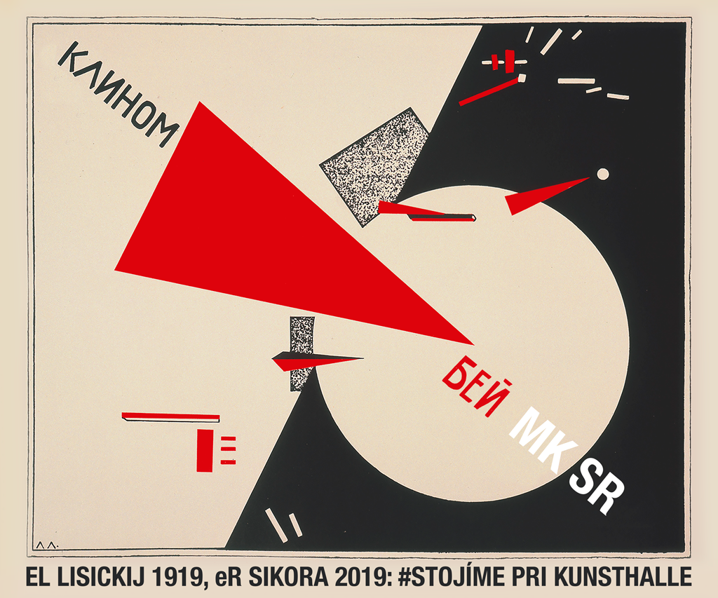 I.K.: Pán Sikora,  grafikou, ktorú ste pripravil na protest proti postupu ministerstva kultúry v súvislosti s Kunsthalle vybíjate hneď niekoľko klinov. Na ľavicové ministerstvo kultúry útočíte kanonickým ľavicovým dielom. Grafiku však môžeme súčasne čítať ako pozvánku na Vašu aktuálnu výstavu El Lissitzky & eR Sikora, ktorá sa ale koná v Danubiane, inštitúcii, o ktorej sa v polemikách tiež uvažovalo ako o možnej Kunsthalle a ktorá na rozdiel od nej získala autonómnu pozíciu a je štedro dotovaná priamo z Ministerstva kultúry.