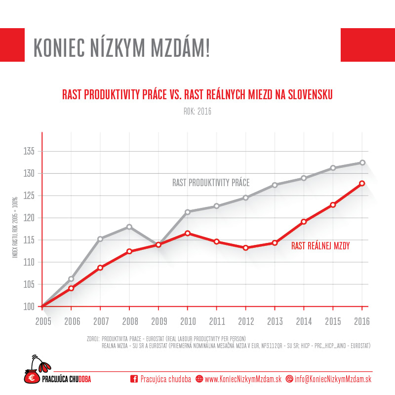 Podľa podpredsedu klubu 500, pána Rosinu, by mala produktivita práce rásť rýchlejšie, ako rastú mzdové náklady, že až potom to je zdravá ekonomika (sic!). Pravdepodobne jemu a zamestnávateľom vadí, že posledné roky mzdy rastú mierne rýchlejšie, ako produktivita práce. Bohužiaľ, nikdy v minulosti som nepočul, že by sa zamestnávatelia sťažovali, keď tomu bolo naopak a keď sa v rámci, z ich pohľadu zdravej ekonomiky, znižoval podiel miezd na HDP/pridanej hodnote.